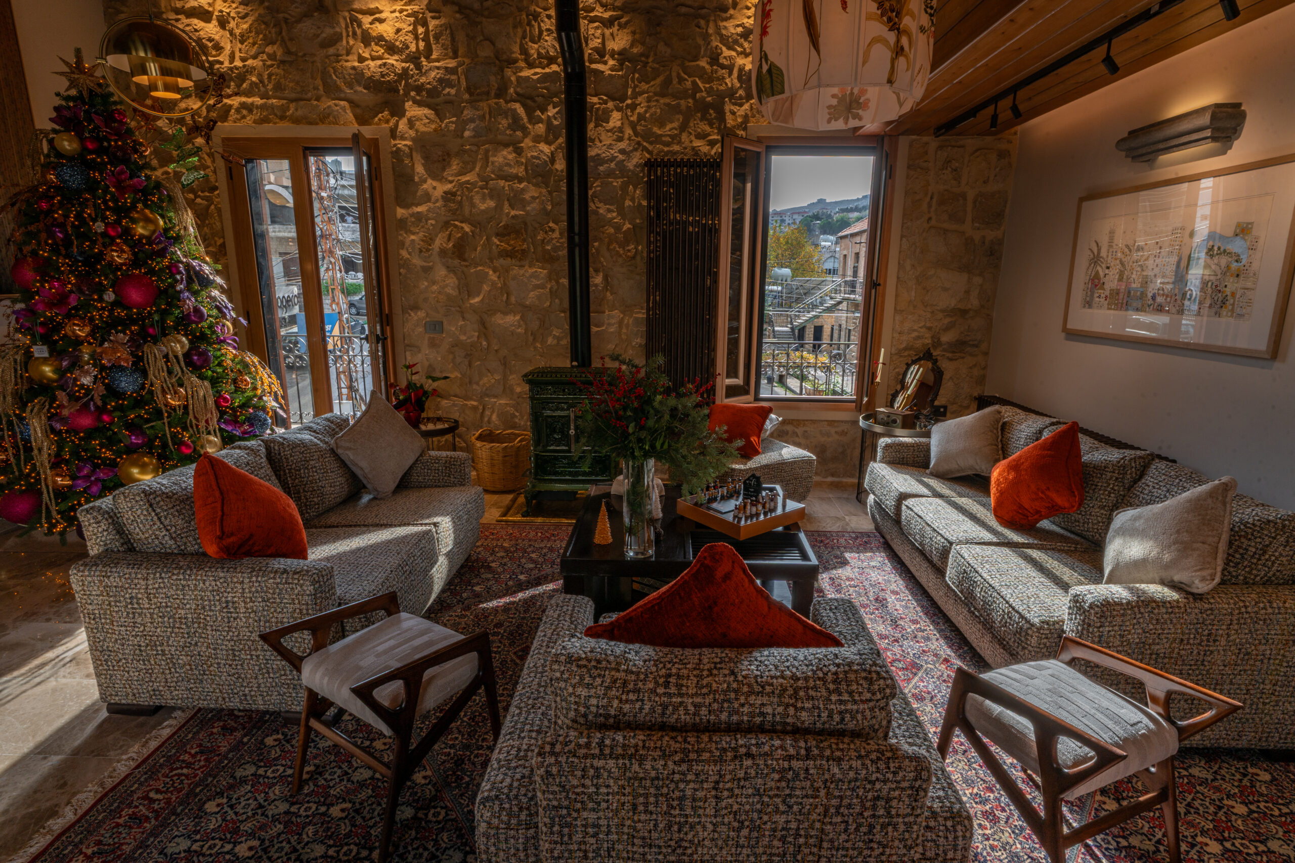 Step into the lounge, where warmth and elegance embrace you. Gather with family or friends beneath graceful arches and ancient stone walls, and let the exquisite décor whisper stories of the past. In winter, the gentle glow of the wood stove casts a cozy spell, inviting you to linger, relax, and savor every moment.